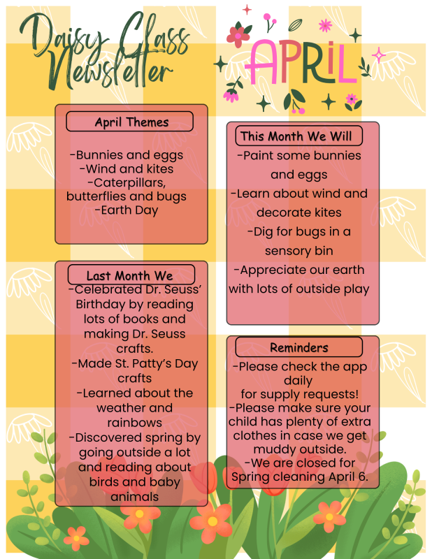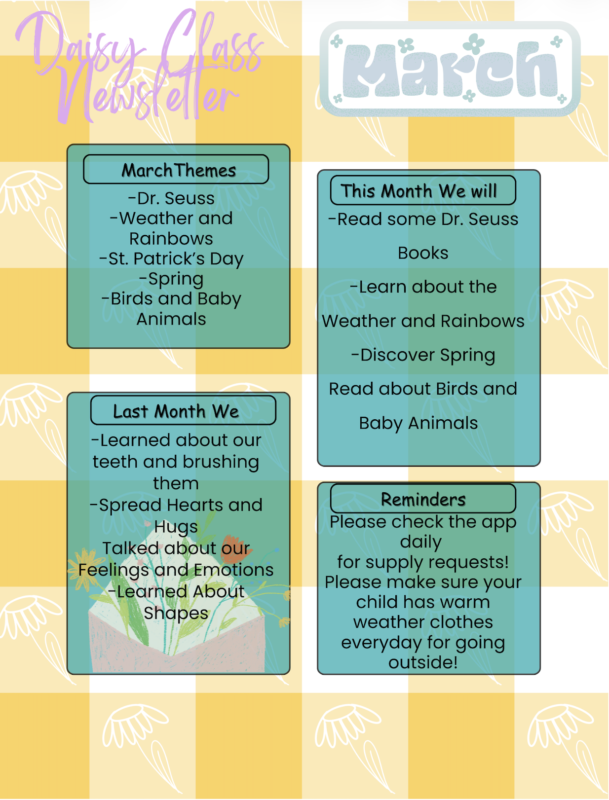 Our Daisy classroom cares for our older 1 year olds, about 18 – 24 month olds. This room follows the same meal and nap schedule as our older classrooms. A main focus in the Daisy class is to help each child start to gain independence and begin to learn to follow a schedule. The Daisies also concentrate on the development of verbal and social-emotional skills.