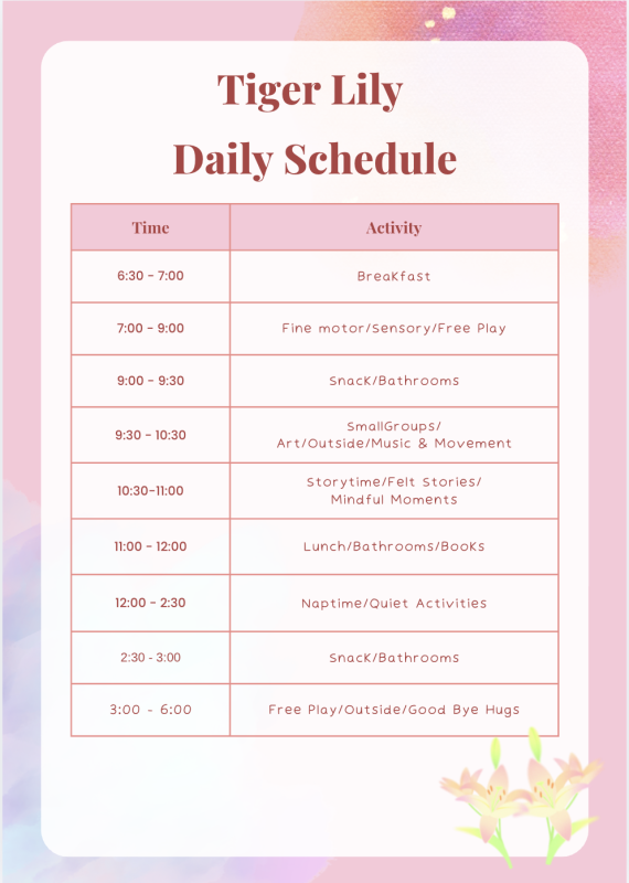 Our Tiger Lily classroom is for our ever-energetic 3 year olds. We make sure to get plenty of movement activities in throughout our day. The Tiger Lilies work together on projects, do plenty of large group activities, and practice conflict resolution skills with their classmates. We focus a lot on individuality and expressing ourselves appropriately through words, play, and relationships.