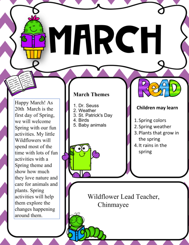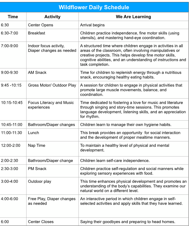 Our Wildflower classroom is designed for the increasingly curious 2 year olds. In this class, teachers do more intentional large group activities and circle times, as the children’s attention spans are increasing. The Wildflowers also introduce more structured centers and small groups throughout the day to help children begin to work together and problem solve. This class is also where we really focus on toilet learning skills.