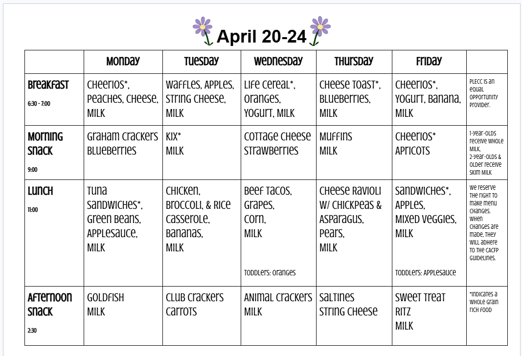 Play & Learn follows the Child and Adult Care Food Program (CACFP) guidelines when planning our meals and snacks. Menus are posted throughout the center, on our website, on the app, and available at the front desk upon request.
